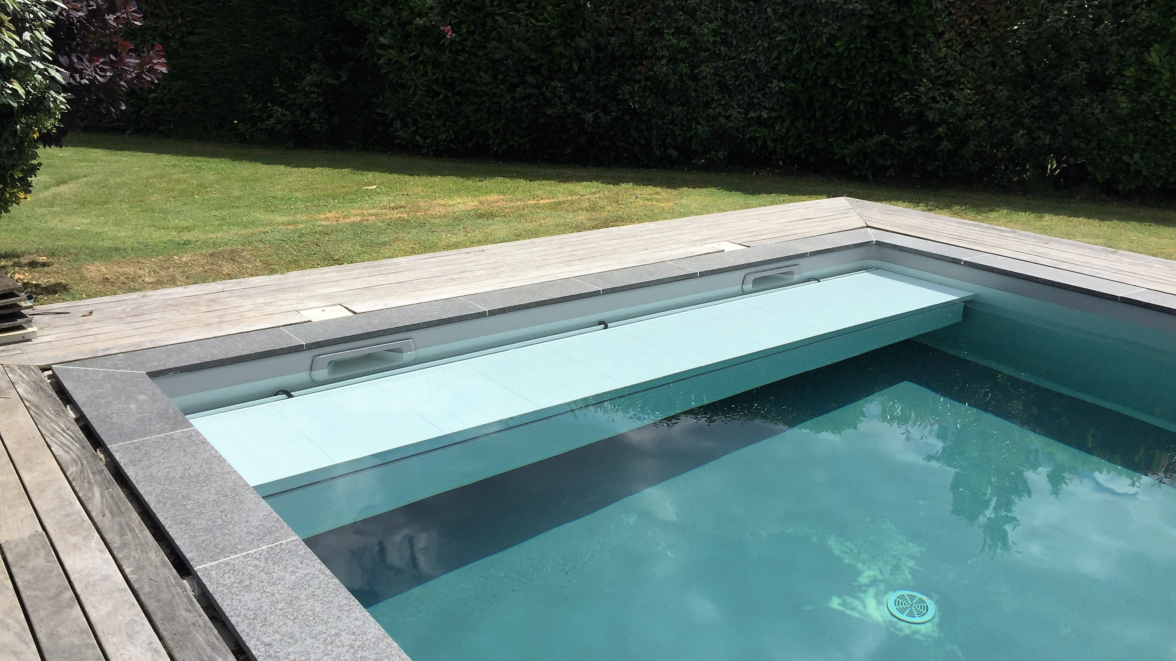 - Les couvertures de piscines, disponibles en versions manuelles ou automatiques, qui recouvrent la surface de la piscine pour empêcher toute chute accidentelle.